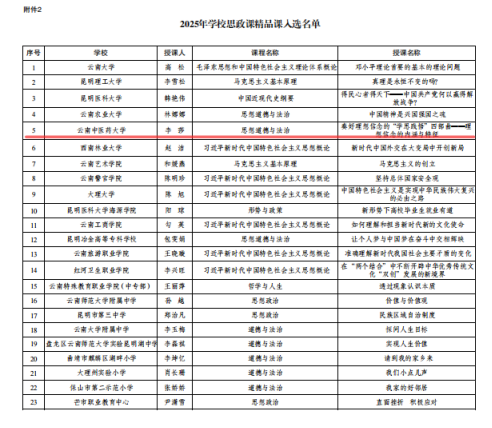 近日,中共云南省委教育工委下发了《2025年度云南省学校思政课名师工作室、精品课程、优秀教案入选名单的通知》。经学校申报、专家评审、网上公示等环节,全省共遴选出14个思政课名师工作室、23个精品课程、37个优秀教案。其中,我校马克思主义学院院长苗丽教授入选思政课名师工作室主持人、李莎老师申报的课程入选思政课精品课、耿立春副教授申报的教案入选思政课优秀教案名单。
