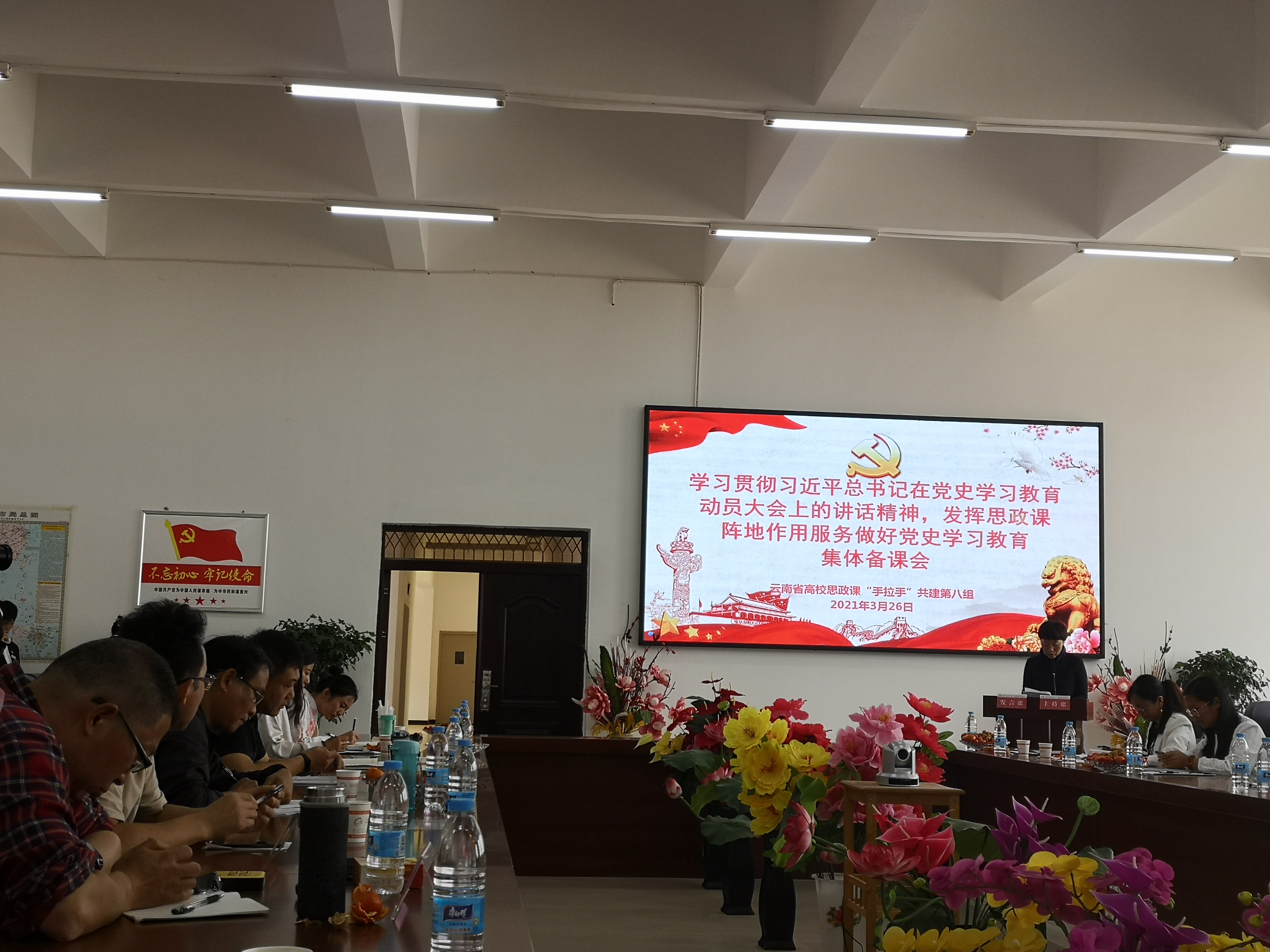 2021年3月26日,由昆明医科大学马克思主义学院主办、云南新兴职业学院承办的云南省高校思政课“手拉手”共建第八组集体备课会在云南新兴职业学院禄劝校区举行。我校马克思主义学院张丽、王珍喜、杨啸老师与来自云南省高校思政课“手拉手”共建第八组成员单位八所高校的100余名思政课教师共同参加了共建活动。此次备课会围绕“学习贯彻习近平总书记在党史学习教育动员大会上的讲话精神,发挥思政课阵地作用服务做好党史学习教育”主题展开。