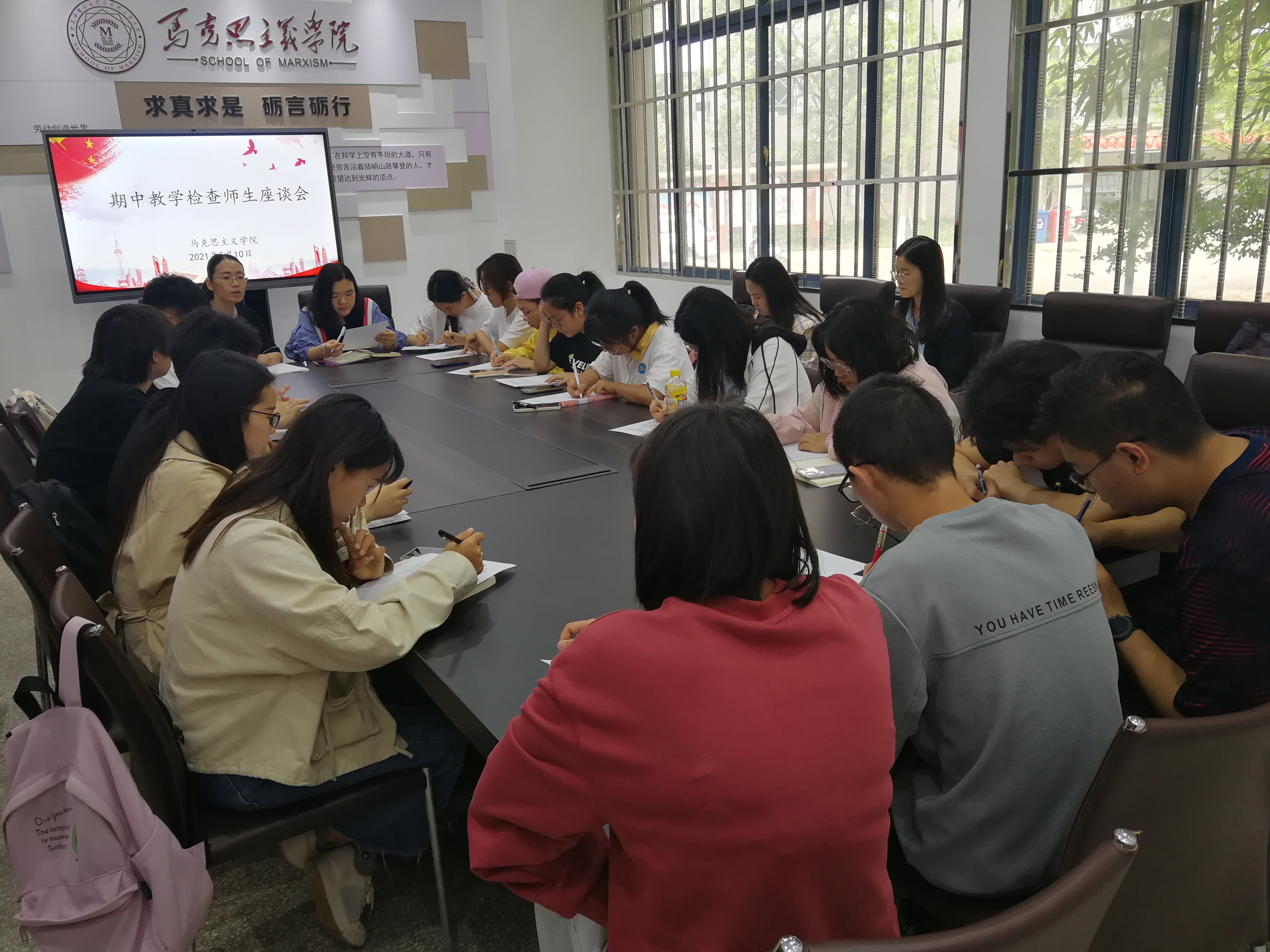 通讯员 廖霜叶5月10日下午,马克思主义学院邀请各专业学生代表召开期中教学检查师生座谈会。院长张丽、副院长苗丽、教研办主任杨永坚以及教师代表廖霜叶参加会议,座谈会由徐芙蓉老师主持。本次会议,首先以填写调查表的形式,对教师教学优缺点和马克思主义学院改进教学建议进行了统计,然后是参会老师与同学的互动环节,最后,学院领导进行会议总结。