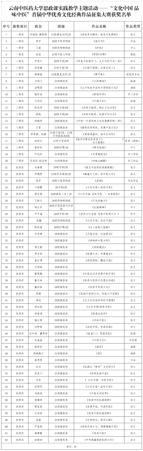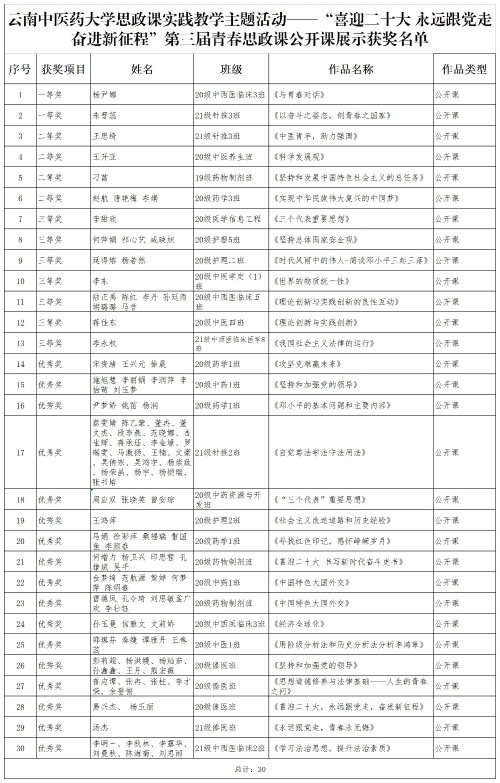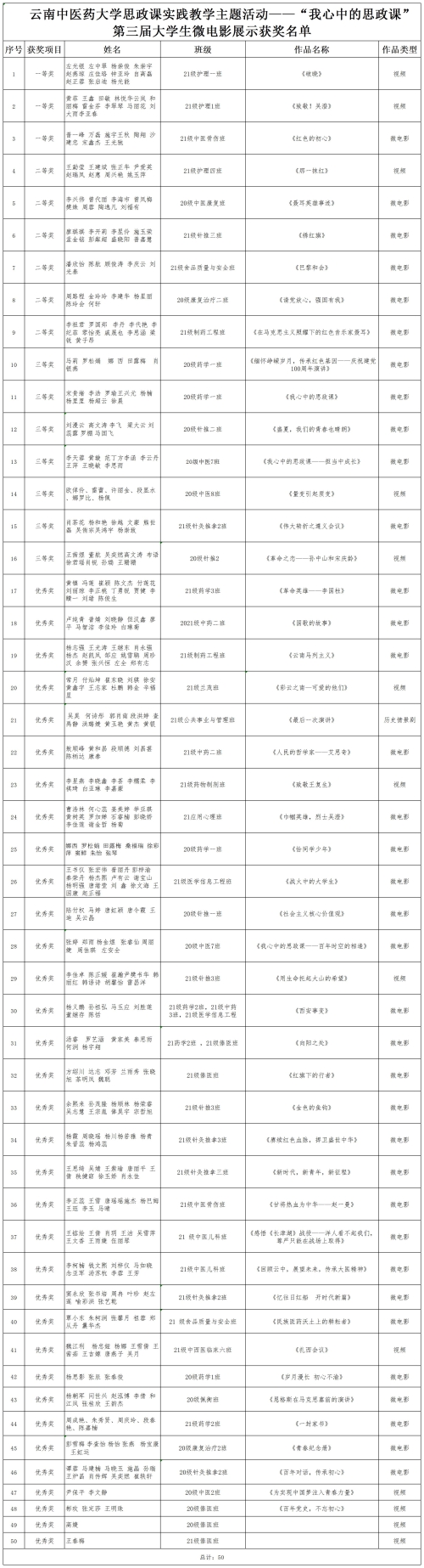 (通讯员 杨尹娜)为充分发挥思想政治理论课作为立德树人关键课程作用,切实增强大学生对思政课的获得感,激发大学生的积极性、主动性、创造性,将思政课堂延伸至课外,引导大学生在社会实践中深化对思政课教学内容的认识和理解,展现新时代大学生的马克思主义理论素养和精神风貌,云南中医药大学教务处、校团委和马克思主义学院联合举办云南中医药大学2021-2022学年第二学期思政课实践教学主题系列活动作品征集。