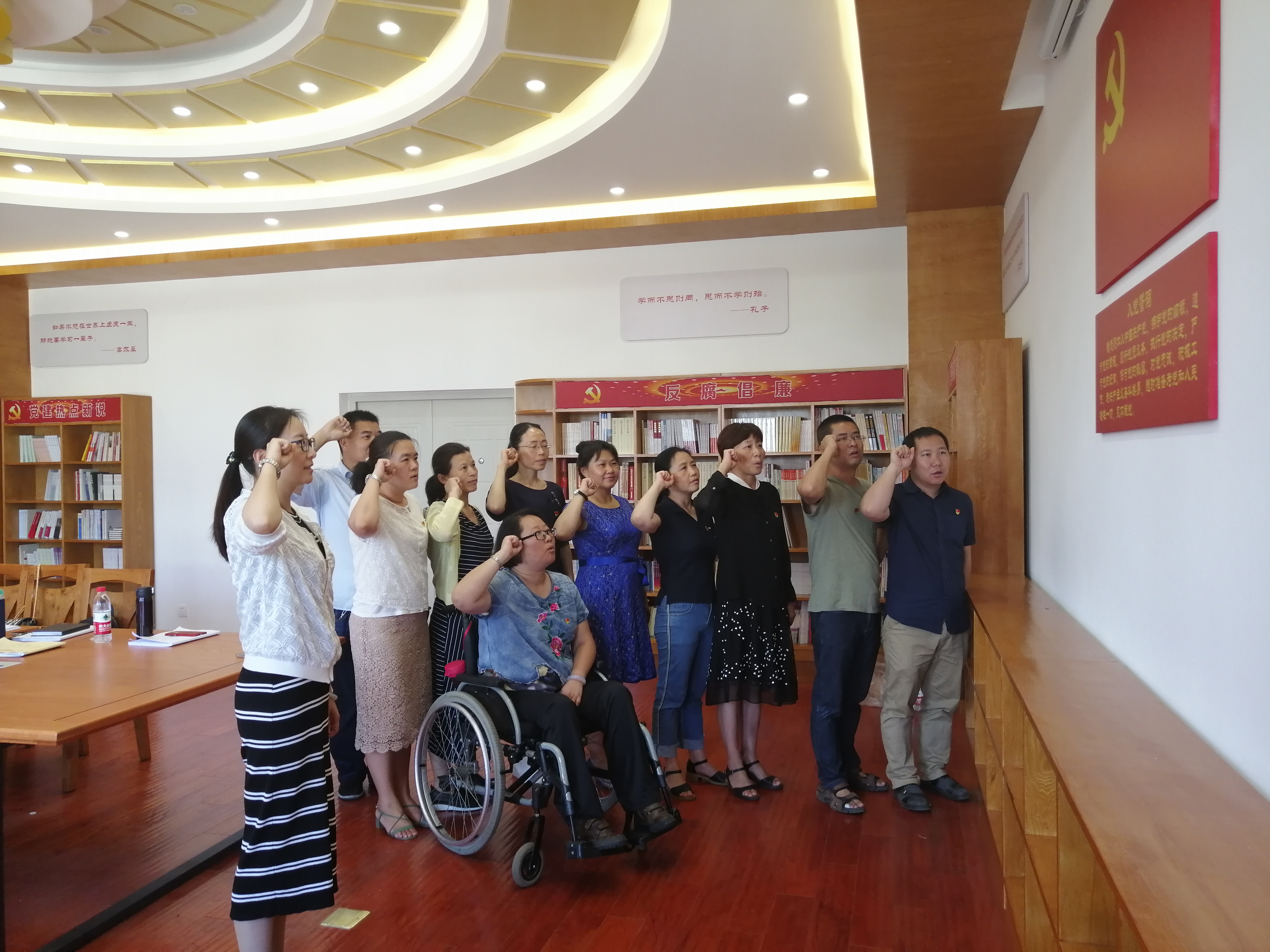在主题教育学习结束后,全体党员在第一支部书记丁梅君的带领下,集体重温入党誓词仪式。